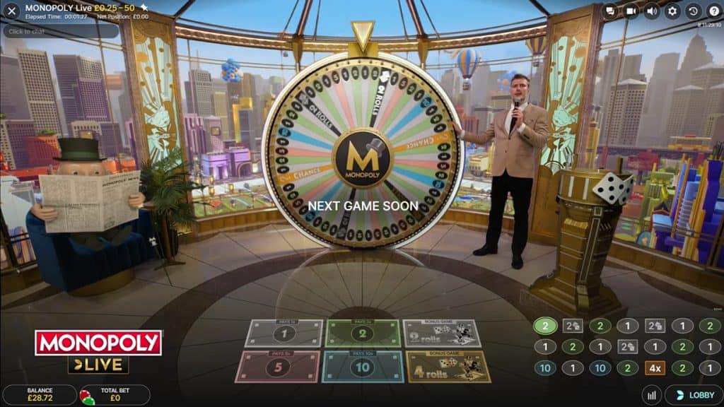 Monopoly Live slot je virtualna verzija popularne društvene igre s kotačem sreće i bonus rundom na 3D ploči. RTP iznosi oko 96,23%, a volatilnost je srednja. Ključna značajka je bonus runda u kojoj se igrač kreće po Monopoly ploči, skuplja nagrade i multiplikatore.